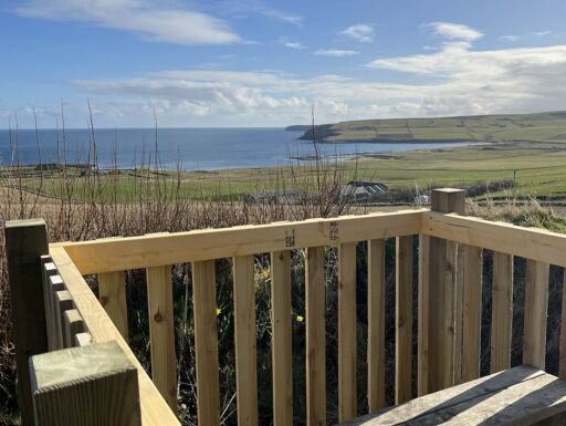 It has wonderful panoramic views of the sea, beaches and cliffs of a south Ronaldsay from it’s new decking area.