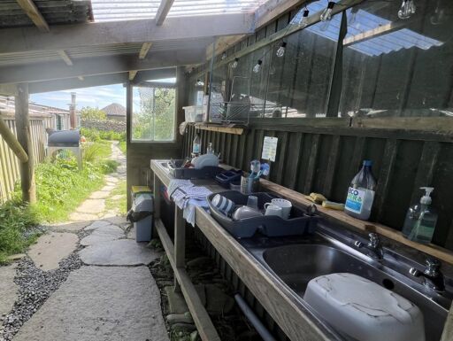 There are two sinks under cover for washing up and for drinking water and a large outside tough for washing wellies etc.